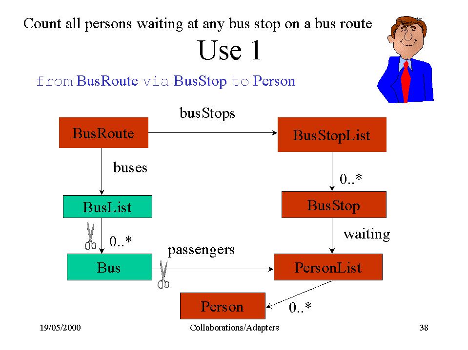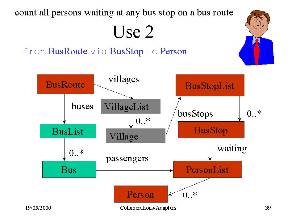 If we wish to count the number of persons riding in buses we call: aBusroute.countPerson(new TraversalGraph("via Bus to Person")). If we wish to count the number of persons waiting at bus stops we call: aBusroute.countPerson(new TraversalGraph("via BusStop to Person")). Note how much navigation code we have eliminated if we use the code in the following two class diagrams:BusRoute BusRoute with villages .