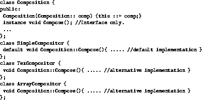 To achieve method update, we extend the standard class construct. A class defines data members and methods, and may redefine methods for its base class. The Composition base class defines method Compose as an instance-stored method, indicating each Composition class instance may vary the implementation of this method. The SimpleCompositor, TextCompositor, and ArrayCompositor classes define implementations of the Compose method of the Composition class. The implementation invoked when a Composition object receives a Compose message depends on whether an instance of the SimpleCompositor, TexCompositor, or ArrayCompositor class has been attached. Note that a Compose message may be sent only to Composition objects.